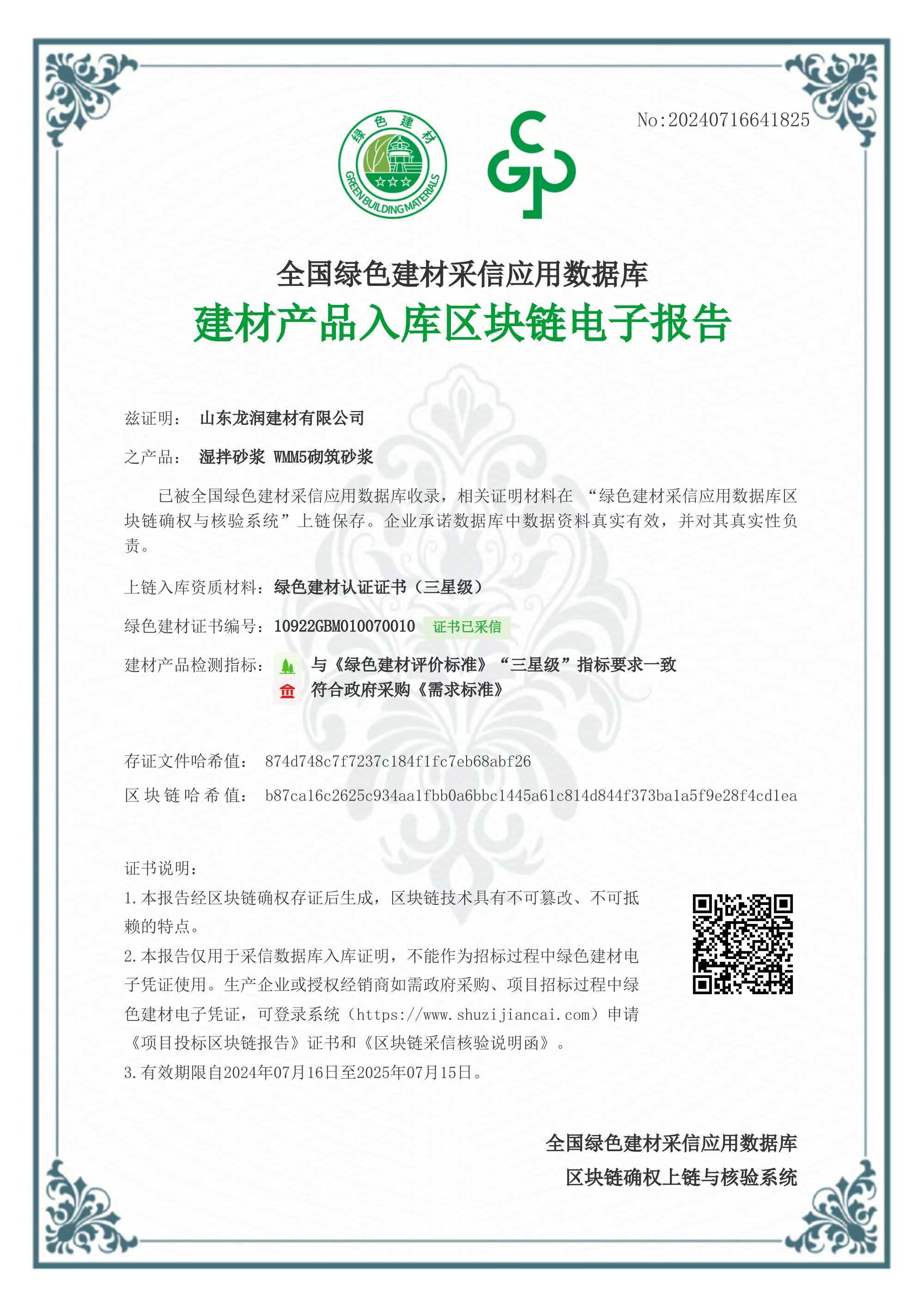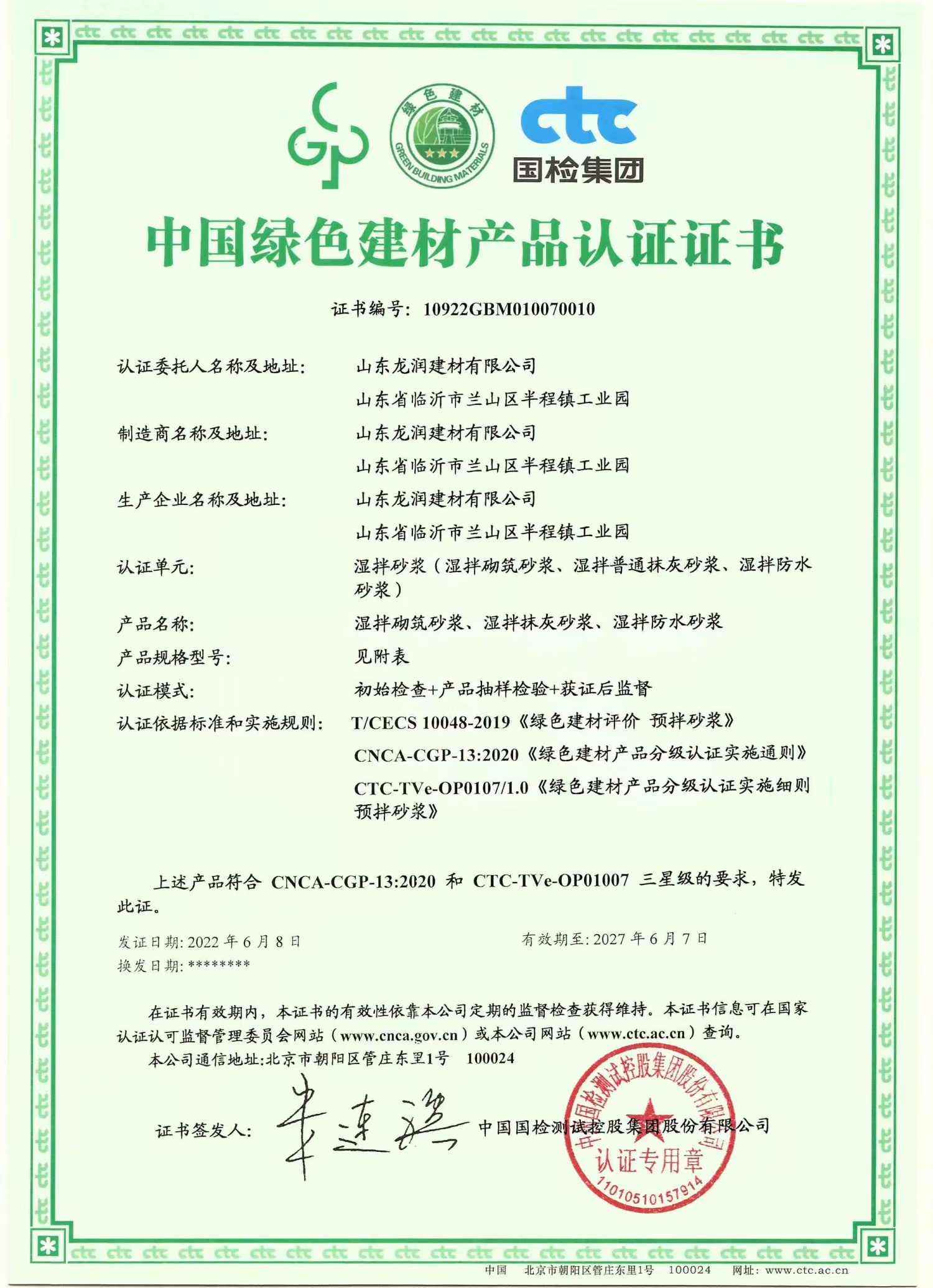 山東龍潤建材有限公司成立于2014年,位于山東省臨沂市蘭山區(qū)半程鎮(zhèn),是濕拌砂漿專業(yè)生產(chǎn)廠家。 2015年山東省經(jīng)信委散裝辦批準(zhǔn)公司成為山東省濕拌砂漿推廣試點(diǎn)單位,給予生產(chǎn)備案許可。同年,公司首家通過ISO質(zhì)量、環(huán)境、職業(yè)健康管理三項(xiàng)體系認(rèn)證,為臨沂首家、山東省首家獲得此三項(xiàng)認(rèn)證的濕拌砂漿企業(yè)。 2016年,公司成功研發(fā)專用于濕拌砂漿的MT系列保塑劑。 2018年,公司成立“濕拌砂漿網(wǎng)”,助力全國范圍內(nèi)推廣濕拌砂漿行業(yè)。同年,成立首家“濕拌砂漿公益講堂”,為行業(yè)企業(yè)培養(yǎng)人才。 2019年,公司策劃開展“濕拌砂漿質(zhì)量萬里行”活動(dòng)。同時(shí),針對(duì)行業(yè)發(fā)展趨勢(shì),提出了濕拌砂漿4.0發(fā)展模式。